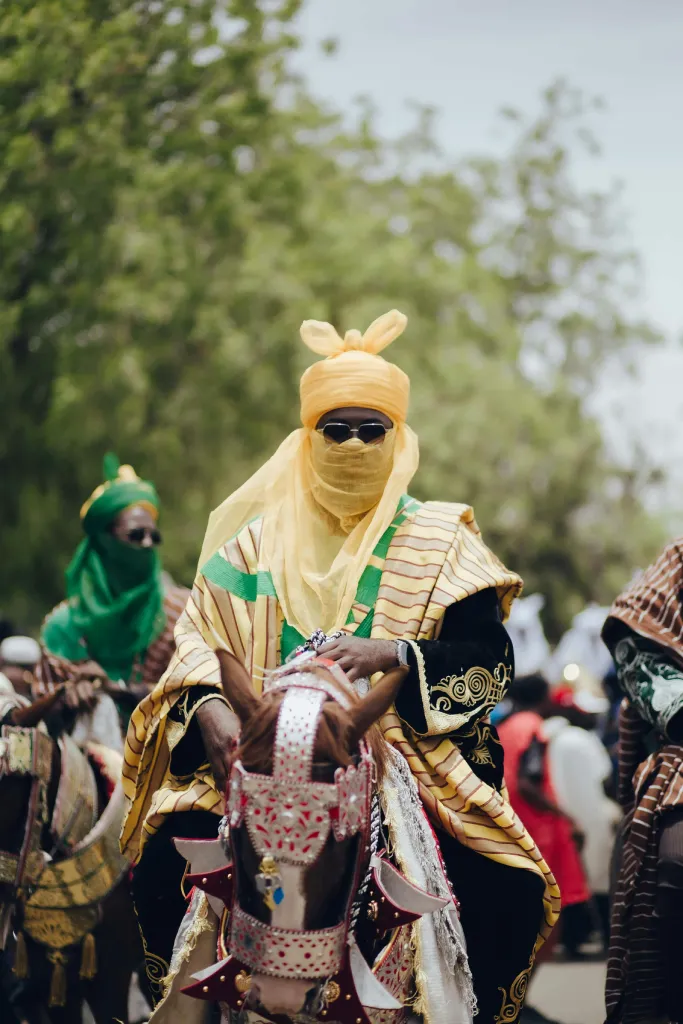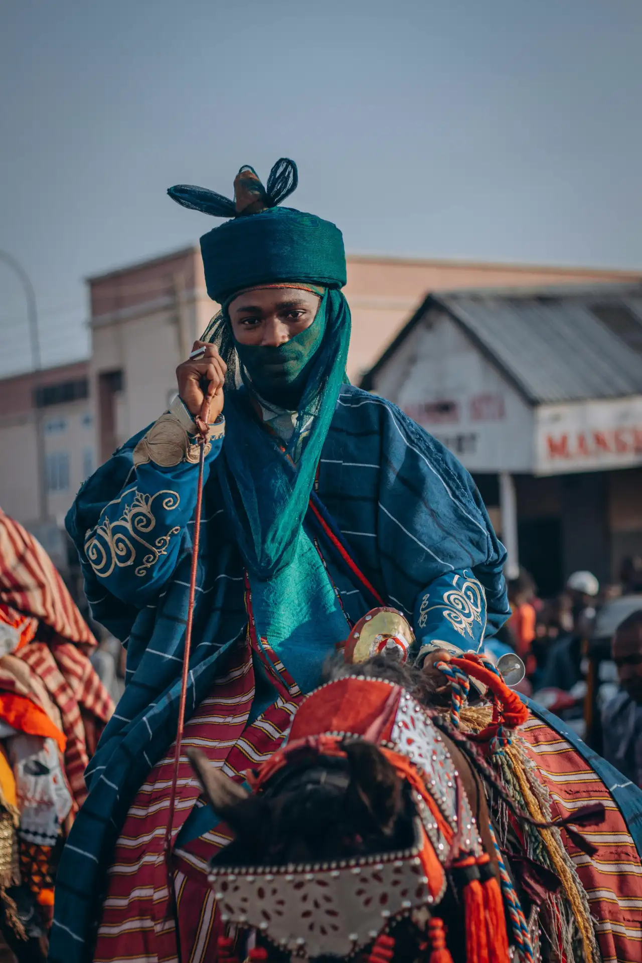 We will head to Kano, in the north of the country, to witness one of the most impressive celebrations: the Durbar Festival. This event, held several times a year by the Hausa ethnic group, coincides with key dates in the Islamic calendar, as the Hausa are Muslim. During the festival, the emir and his court parade on horseback in spectacular attire, followed by performances that serve as a cultural display of the power and skill of the various emirates, all within a majestic atmosphere where percussion instruments take centre stage.